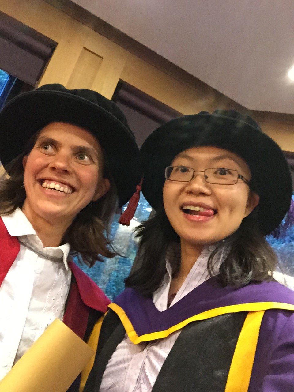 穿上学校提前按照每个人毕业院校及年份预定的的袍子——不知道有多少人注意到欧美大部分学校的博士袍是有各自说道和讲究的,最近听说一个博士生答辩之后从ebay上以看哪个顺眼为标准淘来了一个红巾黑袍,外加一个红色的蓬蓬帽,自己穿上一阵猛拍,认为多快好省地解决了“毕业照”,但网上淘来的跟肯大的博士服差着十万八千里,辛苦读了个学位,山寨了一个博士照,这钱省的还真让人汗——我觉得臭美的同学在考虑读博的时候,可以顺便考虑一下他们的服装颜色,因为要跟一辈子的呀!比如Durham的博士服超好看,跟红衣大主教似的,但有个酒保一样的诡异帽子!而想穿红袍子的就别考LSE了,因为俺们的袍子是学位越高紫色越多,连帽穗都是紫的,跟红色没有半毛关系 T.T